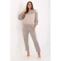 Elegantní a mimořádně pohodlný dámský set v casual stylu, který se skvěle hodí na každý den. Vyrobený z vysoce kvalitní směsi viskózy a elastanu, vyznačuje se materiálem typu máslo, měkkým, jemným a mimořádně příjemným na dotek. Součástí setu jsou mikina a kalhoty, tvořící souvislou, pohodlnou celkovost. Mikina má kulatý výstřih, dlouhý rukáv a přední část je zdobená broží, což jí dodává elegantní, ženský akcent. Kalhoty s vysokým pasem, se zužujícími se nohavicemi a bočními kapsami na zip zaručují pohodlí a praktičnost. Šněrování v pasu umožňuje dokonalé přizpůsobení setu postavě. Toto spojení casual stylu s nádechem elegance je ideální jak pro nošení doma, tak i během každodenních vycházek.