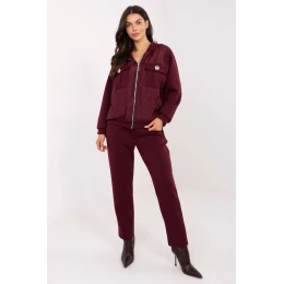 Elegantní teplý komplet skládající se z mikiny a kalhot, ideální pro každodenní, ležérní stylizace. Vyrobený z vysoce kvalitní viskózy s různorodou strukturou, z měkkého, jemného a velmi příjemného materiálu, který zaručuje maximální pohodlí při nošení. Mikina má dlouhý rukáv a praktickou kapuci, na přední straně je zdobena ozdobným prošíváním, které dodává celku moderní charakter. Model se zapíná na zip, co zvyšuje pohodlí nošení. Na hrudi jsou kapsy s patkami, zdobené elegantními brožemi, dodávajícími subtilní originalitu a stylové dokončení. Kalhoty mají vysoký pas, zužující se nohavice a všitý gumový pás s dodatečným šňůrkováním, což zajišťuje ideální přizpůsobení a pohodlí. Jsou také vybaveny bočními, vloženými kapsami, díky čemuž jsou praktické na každý den. Dlouhé nohavice, pohodlné a skvěle padnoucí na postavu. Komplet ohromuje kombinací pohodlí, funkčnosti a módních detailů, ideální pro ženy