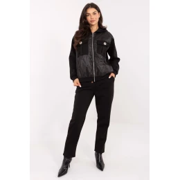Elegantní dresový set skládající se z mikiny a kalhot, ideální pro každodenní, ležérní outfit. Vyrobený z vysoce kvalitní viskózy s různorodou strukturou, ze soft materiálu jemného a mimořádně příjemného na dotek, který zaručuje maximální pohodlí při nošení. Mikina má dlouhý rukáv a praktickou kapuci, zdobenou ozdobným prošívaním, které dodává celku moderní charakter. Model je zapínán na zip, co zvyšuje pohodlí nošení. Na hrudi jsou kapsy s klopnými uzávěry, zdobené elegantními brožemi, dodávajícími jemnou originalitu a stylové dokončení. Kalhoty mají vysoký pas, se zužujícími se nohavicemi a gumou v pase s dodatečným šňůrkováním, co zajišťuje ideální přizpůsobení a pohodlí. Jsou také vybaveny bočními kapsami, které jsou praktické pro každodenní nošení. Nohavice jsou dlouhé, pohodlné a skvěle se usazují na postavě. Set okouzlí spojením pohodlí, funkčnosti a módních detailů, ideální pro ženy oceníchící s