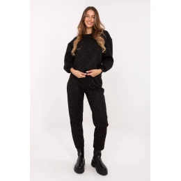 Elegantní dámský teplý komplet skládající se z mikiny a kalhot je ideální volbou v casualovém provedení, skvělý pro každodenní stylizace a pohodlné nošení doma i ve městě. Model s aplikacemi na přední straně mikiny a kalhot (kromě rukávů) přitahuje pozornost, a kombinace krajky a flitrů dodává outfitu moderní, ženský charakter. Mikina s kulatým výstřihem a dlouhým rukávem zaručuje pohodlí a volnost pohybu. Kalhoty mají vysoký pas a dlouhé, sevřené nohavice, což zajišťuje pohodlné nošení a zdůrazňuje siluetu. Boční kapsy dodávají praktičnost a celý kousek je vyroben z příjemné směsi viskózy a elastanu, která zajišťuje pružnost a odolnost materiálu. Tento komplet je ideální volbou pro ženy, které oceňují pohodlí, moderní vzhled a decentní, elegantní detaily v každodenních stylizacích. Materiál je typu "máslo" - měkký, jemný a mimořádně příjemný na dotek.