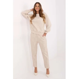 Stylový dámský teplý komplet skládající se z mikiny a kalhot je ideální volbou v casualovém provedení, skvělý pro každodenní stylizace a pohodlné nošení doma nebo ve městě. Model s aplikacemi na přední straně mikiny a kalhot (mimo rukávů) přitahuje pozornost, a kombinace krajky a flitrů dodává sestavě moderní, ženský charakter. Mikina s kulatým výstřihem a dlouhým rukávem zaručuje pohodlí a volnost pohybů. Kalhoty mají vysoký pas a dlouhé, zužující se nohavice, co zajišťuje pohodlné nošení a zdůrazňuje siluetu. Postranní kapsy jsou praktické a celý komplet je vyroben z příjemné směsi viskózy a elastanu, která zajišťuje pružnost a odolnost materiálu. Tento komplet je ideální volbou pro ženy, které oceňují pohodlí, stylový vzhled a decentní, elegantní detaily v každodenních stylizacích. Materiál je typu měkké máslo, jemný a mimořádně příjemný na dotek.
