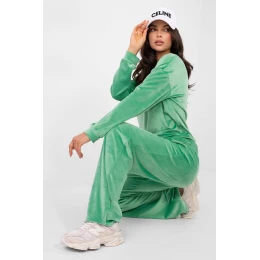 Dámska zamatová súprava pozostávajúca z mikiny a nohavíc vyrobených z mäkkej a príjemnej bavlnenej a polyesterovej tkaniny. Mikina v klasickom strihu s dlhými rukávmi a okrúhlym výstrihom je ideálna na každodenný, ležérny styling. Nohavice s rovnými, dlhými nohavicami a vysokým pásom sú vybavené praktickými bočnými vreckami. Celá súprava je doplnená šnúrkami s drobnými zirkónmi, ktoré celému outfitu dodávajú jemný a elegantný lesk. Hladký vzor a pohodlný strih zaručujú, že táto súprava je skvelá na každodenný a domáci relax.