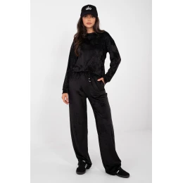 Dámska zamatová súprava pozostávajúca z mikiny a nohavíc vyrobených z mäkkej a príjemnej bavlnenej a polyesterovej tkaniny. Mikina má klasický strih s dlhými rukávmi a okrúhlym výstrihom, ktorý je ideálny na každodenný, ležérny styling. Nohavice s rovnými, dlhými nohavicami s vysokým pásom sú vybavené praktickými vreckami na bokoch. Celá súprava je doplnená šnúrkami s jemnými zirkónmi, ktoré celému outfitu dodávajú jemný a elegantný lesk. Hladký vzor a pohodlný strih zaručujú, že súprava sa skvele hodí na každý deň a domáci relax.