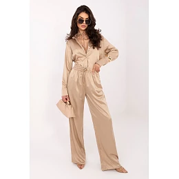Elegantní dámský set skládající se z košile a kalhot je stylovou a univerzální volbou pro mnoho příležitostí, od každodenních vycházek přes pracovní stylizace až po společenská setkání nebo večírky. Hladký vzor dodává celku nadčasový charakter, který snadno sladíte s různými doplňky. Košile s dlouhým rukávem a klasickým límečkem na knoflíky vypadá elegantně a upraveně. Kalhoty s dlouhým nohavici jsou vybaveny praktickými kapsami na bocích a šňůrkou v pasu, která umožňuje dokonalé přizpůsobení postavě. Další výhodou je tenký pásek, který můžete stylově převázat v pasu nebo nosit jako ozdobu na krku, dodávající stylizaci individuální charakter. Set je vyroben z příjemné směsi viskózy, polyesteru a bavlny, což zajišťuje pohodlí nošení, prodyšnost a odolnost. Je to skvělá volba pro ženy, které oceňují pohodlí, eleganci a funkčnost v jednom.