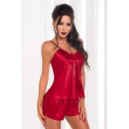 Senzačná súprava z aktuálne módneho saténu vo vínovej farbe. Súprava sa skladá z hladkej blúzky s miernym strihom v páse a mašľou vo výstrihu a pohodlných krátkych nohavíc na gumu. Je veľmi elegantná, ženská a praktická. Je tiež ideálny na dovolenku. Mäkký satén talianskeho pôvodu, exkluzívny, okamžite si ho zamilujete... Nastaviteľné popruhy. Ideálna ponuka aj pre skvelý darček. Špičková kvalita.