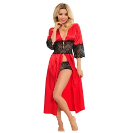 Exkluzívne a zároveň neuveriteľne romantické dlhé negližé zo splývavého saténu je kvintesenciou ženskosti v pôsobivej edícii. Košieľka má v páse širokú krajkovú vsadku, ktorá ho krásne zvýrazňuje. Je zakončený sklenenými gombíkmi, ktoré nepochybne priťahujú pozornosť. Rukávy sú zakončené rovnakou čipkou. Súprava obsahuje koketné krajkové šortky. Celok je dokonalou kombináciou elegancie a originality. Spodná bielizeň je zabalená v krásnom veľkom balení (ideálna pre darček).
