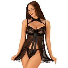 Milujete zmyselnú nočnú bielizeň? Tu je niečo pre vás! Novinka od Obsessive - čierna, vzdušná, veľmi pohodlná a zmyselná nočná košieľka z čiernej čipky a vzdušného tylu. Určite si ju zamilujete... Košieľka má krásne profilované košíčky s kosticami a veľkou saténovou mašľou uprostred modelu. Výstrih je zdobený krásnym ornamentom. Mäkká tkanina, veľmi príjemná na dotyk. Zapínanie na zadnej strane. Tangá sú súčasťou balenia.