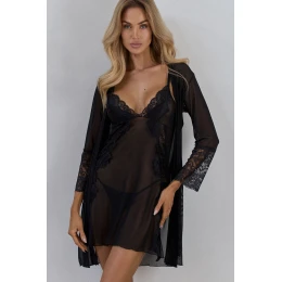 Černý, 3dílný dámský set SAY YES - smyslná elegance pro výjimečné večery. Set SAY YES je nesmírně ženský a smyslný set nočního prádla, vytvořený s ohledem na romantické chvíle. Třídílná kompozice zahrnuje košilku, župan a tanga, vytvářející harmonický a elegantní celek. Košilka s tenkými, nastavitelnými ramínky spojuje lehký, průhledný tyl s jemnou krajkou, decentně zdůrazňuje postavu a dodává stylizaci svůdný charakter. Rozeknutí po stranách, zdobené mašličkami, jí dodává lehkost a ženský šarm. Vzdušný župan z tylu doplňuje set svou jemnou formou. Krajkové zakončení rukávů skvěle ladí s detaily košilky, zdůrazňujíce soudržnost projektu a jeho elegantní styl. Celé doplňují jemné tanga, které posilují smyslný charakter setu. SAY YES je skvělou volbou pro ženy, které oceňují spojení elegance, jemné eleganci a rafinované smyslnosti. Každý model Pure Sin vzniká z prvotřídních materiálů, s důrazem na nejmenší det