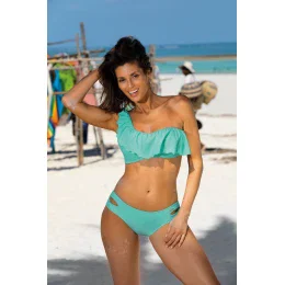 Komplet obsahuje podprsenku viazanú na chrbte, ktorá imituje vrchný diel na jedno ramienko. Výstrih s veľkým, vzdušným volánom, vyrobený z ľahkej talianskej tkaniny, vyzerá fenomenálne. Krásne, slávnostné farby. Podprsenka je bez kostice, má tvarované, skryté vložky na vnútornej strane, ktoré modelujú a spevňujú prsia, vďaka čomu poprsie vyzerá atraktívne. Vložky sa dajú z modelu vybrať, čím vznikne "mäkká" verzia podprsenky. Nohavičky vo veľmi dobrej výške, sú veľmi pohodlné a zdobené zvodnými trhlinkami na bokoch. Zloženie: 80 % polyamid, 20 % elastan.