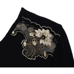 Krátké bolérko s vlnitými okraji, dlouhý rukáv, zavazování na saténovou stužku, na ramenou zdobené průhlednou krajkou.