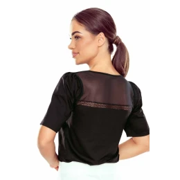 Bluzka Sigala czarna to elegancka propozycja pełna energii i kobiecego wdzięku, idealna dla kobiet ceniących nowoczesny design połączony z klasyczną elegancją. Model został wykonany z wysokiej jakości, miękkiej i elastycznej wiskozy, która doskonale dopasowuje się do sylwetki i zapewnia komfort noszenia przez cały dzień. Głównym elementem dekoracyjnym bluzki jest efektowny dekolt w kształcie litery V, ozdobiony podwójną linią ażurowej, koronkowej taśmy. Geometryczny układ koronki optycznie wysmukla szyję i pięknie eksponuje górną część sylwetki, dodając całości lekkości i nowoczesnego charakteru. Rękawy o: