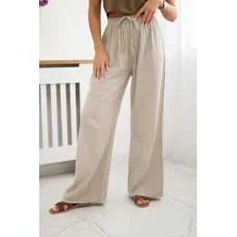 Objavte jedinečné nohavice z mäkkého, priedušného mušelínu, ktoré poskytujú nevídaný komfort pri nosení aj v tých najhorúcejších dňoch. Ich široké nohavice dodávajú celému outfitu módny, moderný charakter, opticky predlžujú postavu a dodávajú celkovému štýlu ľahkosť. Ideálne na každodenné nosenie, do práce aj na špeciálne príležitosti - tieto nohavice sa dokonale kombinujú s rôznymi zvrškami, od minimalistických tričiek cez elegantné blúzky až po svetre. Stavte na klasický a zároveň sofistikovaný dizajn, ktorý vám umožní užívať si pohodlie aj originálny štýl. Veľkosť je univerzálna a zodpovedá ženám nosiacim veľkosti S, M alebo L.