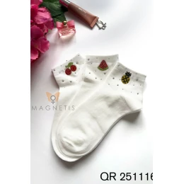 Skarpetki damskie Magnetis QR251116 02 z aplikacją to modny i kobiecy dodatek, który doskonale uzupełni codzienne stylizacje. Klasyczny biały kolor został ozdobiony efektowną aplikacją w kształcie ananasa oraz subtelnymi, dekoracyjnymi kryształkami, które nadają całości wyjątkowego charakteru. To idealne skarpetki wzorzyste dla kobiet, które cenią modne detale i stylowe akcenty. Wysoka zawartość bawełny (92%) zapewnia miękkość, przewiewność i komfort noszenia przez cały dzień. Dodatek elastanu (8%) gwarantuje elastyczność oraz idealne dopasowanie do stopy, dzięki czemu skarpetki nie zsuwają się i zachowują swój kształt nawet po wielokrotnym praniu. Materiał jest przyjemny dla skóry oraz odporny na deformacje. Model QR251116 02 świetnie sprawdzi się w stylizacjach casualowych, sportowych oraz w modnych zestawach z nutą elegancji. Doskonale komponuje się ze sneakersami, trampkami, balerinami czy loafersami. Skarpetki z aplikacją Magnetis łączą wygodę, jakość i modny design.