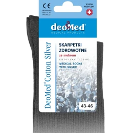 DEOMED COTTON SILVER-skarpetki zdrowotne z przędzy bawełnianej ze srebrem Skład: bawełna 72%, Prolen® Siltex ze srebrem 25%, Elastan 3%. Specjalna konstrukcja cholewki i niewielka domieszka elastanu w całym wyrobie powodują idealne bezuciskowe przyleganie do nóg i maksymalną elastyczność - nietamowanie przepływu krwi i komfort nawet dla opuchniętych nóg. Bezszwowe łączenie nad palcami gwarantuje wygodę osobom o bardzo wrażliwych stopach, np. stopach cukrzycowych. Zawartość jonów srebra w przędzy PROLEN®Siltex hamuje rozwój mikrobów, zapewniając skuteczne działanie antybakteryjne i antygrzybicze. Do produkcji skarpetek jest używana czysta bawełna - naturalna przędza najwyższej jakości.