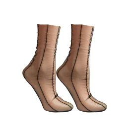 Cienkie skarpetki damskie wykonane z siateczki z podłużnymi cienkimi paseczkami w kształcie szwów to stylowy i nowoczesny dodatek do garderoby, który łączy elegancję z delikatnym, nieco odważnym designem. Siateczkowa struktura materiału nadaje im subtelnej przezroczystości, co dodaje lekkości i wyrafinowanego uroku. Paski przypominające szwy biegną pionowo wzdłuż skarpetek, tworząc iluzję przedłużenia nóg i podkreślając ich smukłość. Paski te są cienkie i równomiernie rozmieszczone, nadając całości eleganckiego, ale minimalistycznego charakteru. Ze względu na swoją przezroczystość i styl, te skarpetki świetnie sprawdzą się zarówno do eleganckich, jak i bardziej casualowych stylizacji, dodając im modnego, ale subtelnego wykończenia.