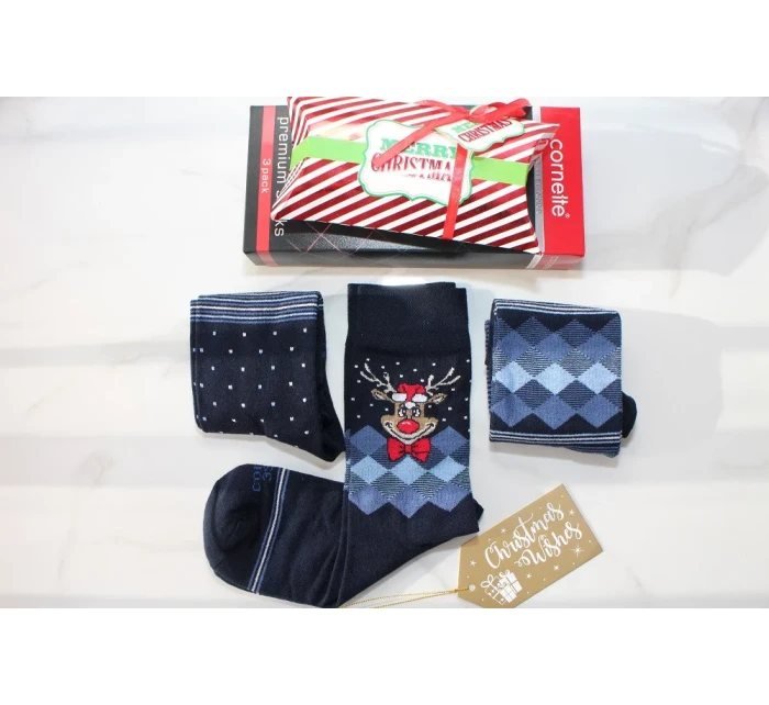 Blížia sa sviatky, a tak pre svojich blízkych ulovte túto jedinečnú trojicu pánskych ponožiek od známej značky Cornette. V nápadnej krabičke so sklom nájdete tri páry v tmavo modrej farbe - dva so svetlým vzorom, tretí so známym sobom Rudolfom. Vysoko kvalitné, mäkké povrchy, odolná štruktúra a ploché, pohodlné švy.
