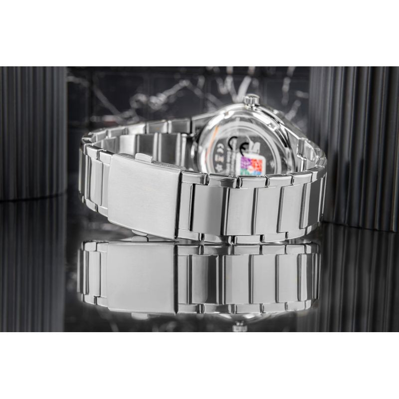 Minimalistyczna tarcza to symbol elegancji, a precyzyjnie rozmieszczone indeksy dodają jej charakteru bez zbędnych ozdobników. Smukłe, ostro zakończone wskazówki idealnie wpisują się w klasyczny design, zapewniając czytelność i precyzję w każdej chwili. Subtelny datownik na godzinie szóstej to praktyczny detal, który ułatwia codzienne życie, nie zaburzając harmonii projektu. Mając ten zegarek, mężczyzna zyskuje nie tylko solidny czasomierz, ale też dodatek, który podkreśla jego klasę, niezależność i dobry gust.