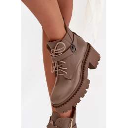 Skórzane Botki Damskie Na Klocku Z Ozdobnym Paskiem Ocieplane Zazoo 60557 Ciemnobeżowe