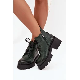 Skórzane Botki Damskie Na Klocku Z Ozdobnym Paskiem Ocieplane Zazoo 60557 Ciemnozielone