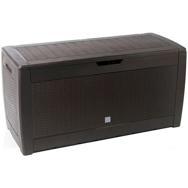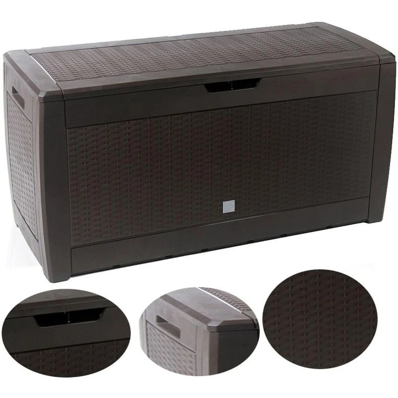 Box RATIO PLUS s elegantnou povrchovou úpravou imitujúcou ratan je ideálny na uskladnenie vankúšov, prikrývok, náradia, záhradných hračiek alebo iných predmetov, ktoré chráni pred prachom alebo dažďom.