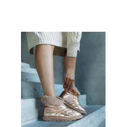 Zlaté zateplené sněhule s lemováním Caellita jsou ideální obuv pro ty, kteří ocení moderní styl a pohodlí. Jejich módní vzhled s kulatou špičkou a platformou poskytuje stabilitu na zasněžených ulicích a dodatečné zateplení interiéru udržuje nohu teplou i v nejchladnější dny. Zlaté detaily přidávají eleganci a skvěle doplňují každý zimní outfit. Vyrobené z látky, mají béžovou gumovou podrážku a uzavírání na lemování, což je dělá nejen stylovými, ale také praktickými. Ideální na podzimní a zimní dny!