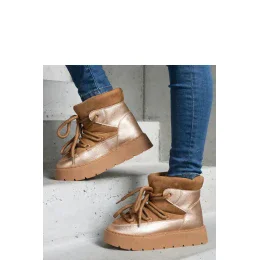 Hnedé kožené snehule s platformou Sapphi sú štýlovou a funkčnou obuvou ideálnou na zimu. Sú vyrobené z kvalitnej ekokože a majú šnurovaciu časť, ktorá zaručuje dokonalé prispôsobenie sa nohe. Vďaka elastickej gume sa ľahko obúvajú a vyzúvajú, zatiaľ čo teplá kožušinová podšívka zaručuje pohodlie a ochranu pred chladom. Okrúhla špička a pevná platforma im dodávajú módny vzhľad, zatiaľ čo hnedá farba podrážky im dodáva elegantný charakter. Tieto snehule budú skvelou voľbou na chladnejšie dni a dodajú štýl a pohodlie každej zimnej štylizácii.