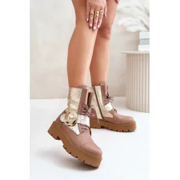 Výnimočné topánky z prírodnej kože. Stoja na platforme a plochom podpätku, čo zaručuje stabilitu a pohodlné nosenie. Model so zipsom je vybavený aj šnúrkami pre lepšie nosenie. Veľká pracka s pásikom na zvršku je výrazným detailom, ktorý im dodáva módny, osobitý charakter.