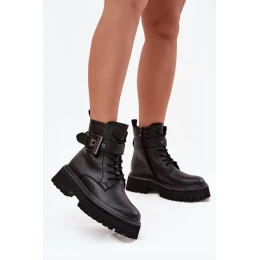 Pracovné čižmy pre ženy vyrobené z prírodnej kože. Model s platformou poskytuje stabilitu a pohodlie pri nosení. Čižmy sú šnurovacie a zapínajú sa na zips, vďaka čomu sa dokonale prispôsobia nohe a ľahko sa obúvajú. Vnútro je vystužené, čo zaručuje pohodlie a teplo počas chladnejších dní. Ozdobný pásik s prackou im dodáva charakter a módny, mierne rockový štýl. Sú skvelou voľbou na každodennú štylizáciu.