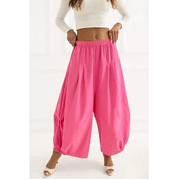 Dámske zamatové nohavice vo voľnom strihu typu aladki, ideálne na každý deň. Sú vyrobené z mäkkej a príjemnej bavlny, ktorá zaručuje pohodlie pri nosení a priedušnosť. Model s vysokým pásom a vloženou gumou, ktorá sa prispôsobí postave a zaručuje pohodlie počas celého dňa. Široké nohavice s dĺžkou 7/8 dodávajú celku ľahký a moderný charakter. Nohavice v jednoduchom vzore, bez zapínania a vreciek, čo podčiarkuje ich minimalistický štýl a uvoľnený, nenáročný vzhľad.