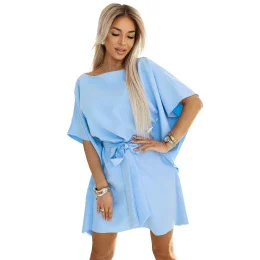 Elegantní, vzdušné šaty se zavazováním v pase, vyrobené z vysoce kvalitní látky ve světle modré barvě. Polská výroba, značka Numoco.