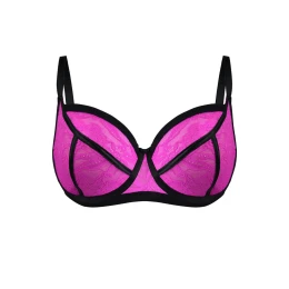 Biustonosz JOY SOFT 19234 to wyjątkowe połączenie intensywnej kolorystyki, romantycznej koronki i komfortu codziennego noszenia. Miękkie miseczki wykonane z przewiewnego tiulu pokrytego różowym plenem delikatnie otulają biust, nie powodując ucisku, a jednocześnie zapewniając subtelne modelowanie. Czarny kontur z ozdobnymi przeszyciami nadaje całości nowoczesnego stylu i kontrastowego efektu. Biustonosz posiada regulowane ramiączka, klasyczne zapięcie na haftkę oraz lekki obwód bez fiszbin, który zachowuje stabilność i dopasowanie.