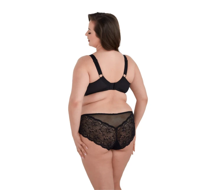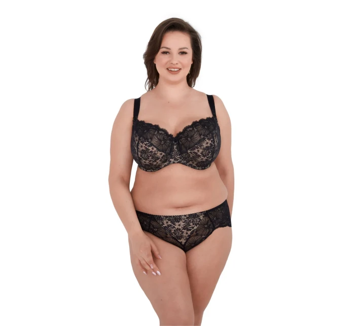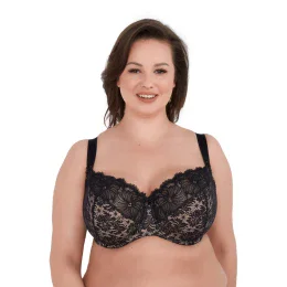 Celý košíček je vyrobený z nápadnej čiernej kvetinovej čipky, ktorá dodáva spodnej bielizni jedinečný pôvab a zmyselnosť. Spodná časť košíčkov je podšitá elastickým úpletom a vnútro je zakončené jemnou bavlnou, ktorá je šetrná k citlivej pokožke. Bočné kostice zabraňujú zvlneniu látky a zvyšujú pohodlie nositeľky. Široké, nastaviteľné ramienka dokonale podopierajú poprsie bez tlaku.