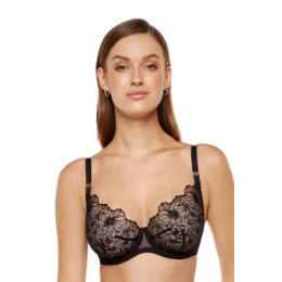 Mäkká vystužená podprsenka Noire je očarujúca originálnou kvetinovou výšivkou so saténovým povrchom. Polopriehľadné košíčky zvýrazňujú poprsie a elegantné strieborné detaily na ramienkach dodávajú celku štýl. Vankúšiky sú mäkké a polopriehľadné. Originálny vyšívaný vzor s ľahkým saténovým povrchom. Strieborné detaily dodávajú podprsenke eleganciu. Zvislé bočné kostice stabilizujú obvod podprsenky. Zadná časť je vyrobená z elastického tylu. Ramienka sú nastaviteľné a nedajú sa odopnúť. Podprsenka bola navrhnutá a vyrobená v Poľsku.