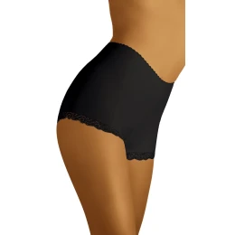 Vyšší šortky, jemně tvarující postavu, z hladkého, pružného úpletu. Jemně zdobené jemnou krajkou kolem stehen. Hladká černá barva. Složení: 83 % polyamid, 17 % elastan.