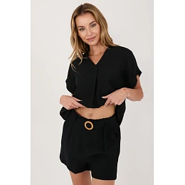 Elegantní a pohodlné dámské kraťasy vyrobené z lehkého a příjemného materiálu budou ideální volbou na každý den. Model vyrobený z směsi viskózy a polyamidu poskytuje pohodlí, prodyšnost a odolnost, díky čemuž se skvěle hodí na teplé dny. Kraťasy mají krátké rovné nohavice, které zaručují volnost pohybu a univerzální vzhled hodící se k mnoha stylizacím. V pase je vsazena elastická guma, která se přizpůsobí postavě, zajistí pohodlí bez nutnosti zapínání. Další výhodou jsou praktické kapsy a pásek s přezkou, který zdůrazňuje pas a přidává celku módní charakter. Hladký vzor zajišťuje, že kraťasy lze snadno sladit jak s volným tričkem, tak s elegantní blůzou. Je to skvělý návrh na každodenní výlety, procházky nebo setkání ve letním stylu.