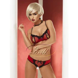 Výjimečně sexy set s podprsenkou s košíčky s kosticemi uprostřed a kalhotkami s otevřeným rozkrokem. Je vyroben z červené elastické kabaretní látky, která je na okrajích ovinuta krásnou černou krajkou. značka Irall. Složení: 44 % polyamid, 39 % viskóza, 17 % elastan.
