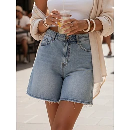 Jeansowe spodenki o luźniejszym kroju zapewniają wygodę i swobodę ruchów w codziennym użytkowaniu. Wysoki stan dobrze podkreśla talię i pomaga zachować proporcje sylwetki. Dłuższa nogawka nadaje całości nowoczesny, casualowy charakter. Model sprawdza się w letnich stylizacjach miejskich, urlopowych i weekendowych.