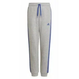 - Módne tepláky adidas v sivej farbe s modrými pruhmi a logom.