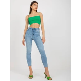 Dámske modré džínsy vo vypasovanom strihu.
