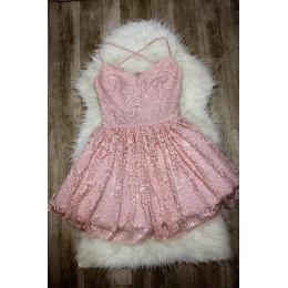 Společenské dámské šaty na ramínka krajkové s sukní růžové Růžová / L model 15042968 - Sherri