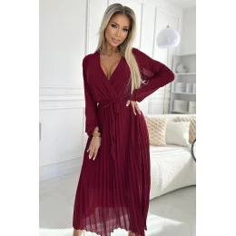 Plisované šifónové šaty s hlbokým výstrihom, dlhými rukávmi a opaskom na zaväzovanie. Vyrobené z ľahkého materiálu vo vínovej farbe. Ideálne na každú príležitosť. Značka Numoco Basic. Európska výroba.