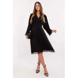 Elegantní rozkročené šaty, které kombinují eleganci s jemnou ženskou grácií. Vyrobené z vysoce kvalitní směsi polyesteru a viskózy, jsou příjemné na dotek, vzdušné a skvěle padnou na postavu. Model midi délky s klopovým výstřihem krásně zdůrazňuje postavu, zatímco rozkročený střih dodává lehkost a volnost. Dlouhé rukávy a krajkové detaily na manžetách a spodku šatů dodávají celku jemnost a eleganci. Vsazované gumy na pasu vzadu zajistí ideální přizpůsobení a pohodlí při nošení a zvýrazní zároveň pas. Šaty nemají zapínání, což je činí mimořádně pohodlnými na oblékání. Skvělá volba na každý den do práce, stejně jako na více slavnostní příležitosti, kdy chcete vypadat elegantně a cítit se volně.