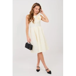 Elegantní návštěvní šaty vytvořené s ohledem na výjimečné příležitosti a stylové večírky. Rozkročený střih krásně zdůrazňuje pas a dodává siluetě lehkost, zatímco délka za koleno přidává třídu a nadčasovou eleganci. Model vyrobený z vysoce kvalitní směsi polyesteru a viskózy, která zajistí pohodlí nošení a dokonalé uspořádání materiálu. Různorodá struktura látky dodává celku originální charakter a jemnou hloubku. Šaty bez rukávů s klasickým kulatým výstřihem vypadají mimořádně elegantně. Zapínání v pasu s ozdobnými záhyby krásně modeluje siluetu a zdůrazňuje ženské tvary. Součástí je zapínací opasek, který navíc zdůrazňuje pas, a odnímatelná brož ve tvaru květu, umožňující sladit outfit s příležitostí. To je skvělá volba na večírky, rodinné oslavy a elegantní setkání, kdy chcete vypadat výjimečně a s elegancí.