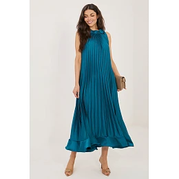 Plisované kokteilové šaty sú elegantným dizajnom, ktorý je ideálny na špeciálne príležitosti a večierky. Ich ľahký a vzdušný strih s midi dĺžkou krásne padne pri pohybe, zvýrazní ženskú siluetu a dodá outfitu jemnú ľahkosť. Model bez rukávov s klasickým okrúhlym výstrihom pôsobí nadčasovo a elegantne. Originálnym prvkom je šnurovanie na ľavom ramene, ktoré šatám dodáva jedinečný charakter a priťahuje pozornosť. Spodná časť zdobená jemným volánom dodáva celku romantický šarm a ľahkosť. Hladký materiál zložený z polyesteru, viskózy a elastanu zaručuje pohodlie pri nosení, správne padnutie a voľnosť pohybu. Ide o ideálne šaty na návštevu a večierok pre ženy, ktoré ocenia eleganciu v modernom dizajne.
