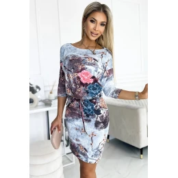 Športové šaty so zaväzovaním, 3/4 rukávmi a vreckami - kvety na kamennom pozadí. vyrobené z elastického materiálu s mierne semišovou štruktúrou. leštený výrobok. značka numoco.