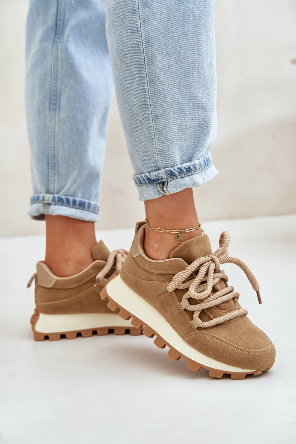 Tenisky pre dámy sú vyrobené z ekologického semišu. Osadené na platforme s vypuklinami. Penová vložka zaručí pohodlie pri každom kroku. Hrúbkové väzanie umožní správne prispôsobenie obuvi šírke nohy. Tento model dokonale doplní mnoho outfitov a dodá im športový štýl!