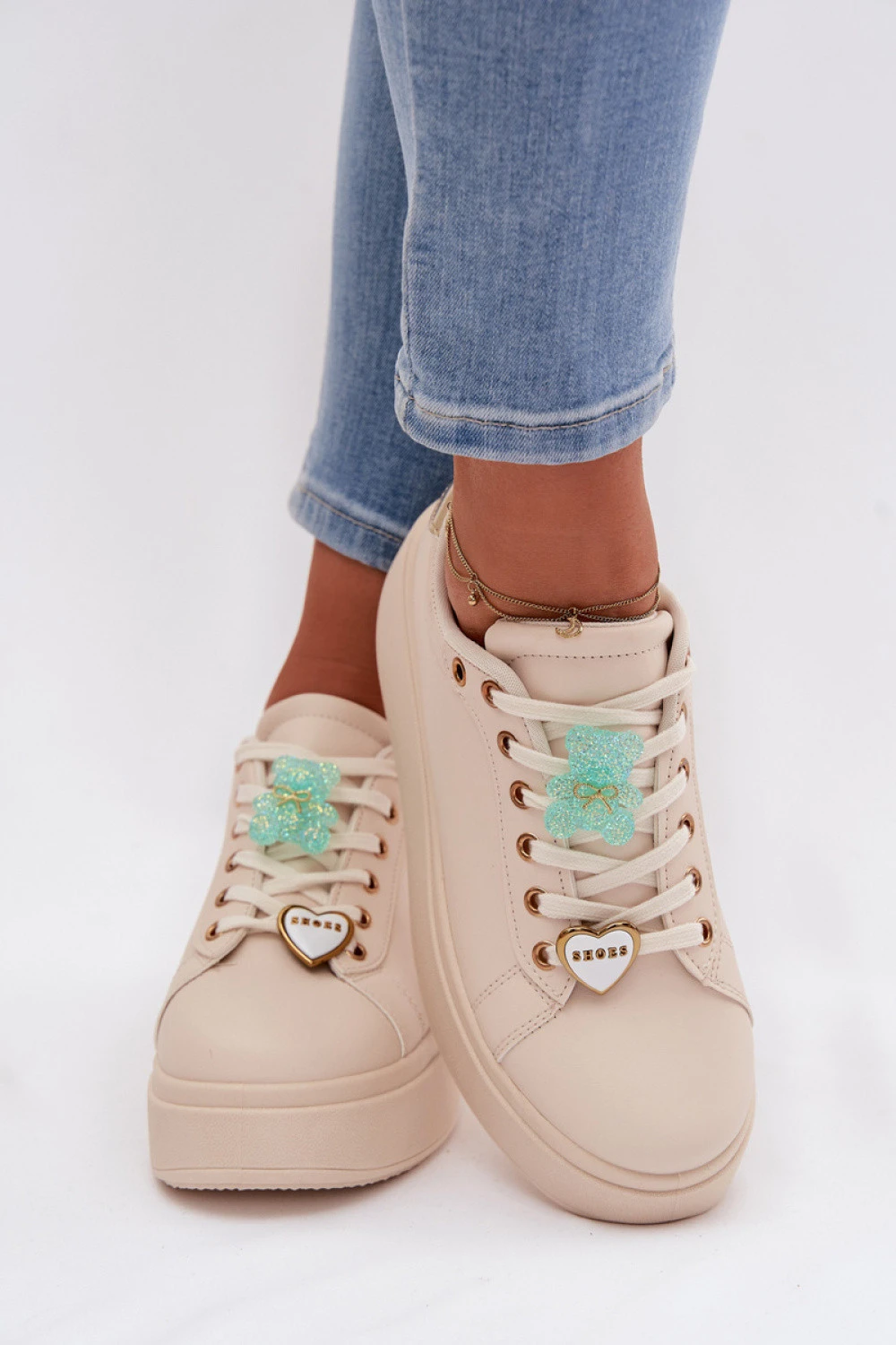 Štýlové dámske tenisky z ekokože sú originálnou ponukou pre milovníčky módnych detailov. Model osadený na platforme jemne zvýrazňuje postavu a zaručuje pohodlie pri nosení. Šnurovanie zdobené prackami v tvare medvedíka a srdiečka dodáva osobitý, dievčenský charakter. Mäkká stielka z peny, dodatočne potiahnutá materiálom, zaručuje pohodlie počas celého dňa. Tieto tenisky sú ideálne na každodennú mestskú štylizáciu. materiál koža