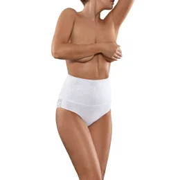 Dámske sťahovacie nohavičky 148 white plus BABELL - biela farba - s vyšším pásom - sťahujú a tvarujú boky a bruško - zdobené jemnou čipkou s kvetinovým motívom - materiálové zloženie spodného dielu : 92% bavlna + 8% elastan Materiálové zloženie : 87% polyamid + 13% elastan