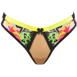 Doplňte svou soupravu spodního prádla o neonový akcent díky tangům V-11838. Měkký béžový tyl jemně obepíná tělo, zatímco barevné neonové výšivky upoutávají pozornost a podtrhují charakter celé soupravy. Pohodlný elastický pás v intenzivní žluté barvě zajišťuje pohodlí a perfektní přizpůsobení, zatímco kontrastní černé lemování jemně zdůrazňuje tvar. Tanga, která kombinují lehkost, výrazné barvy a elegantní rafinovanost.