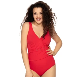 Zdanlivo obyčajné jednodielne plavky získajú efektnú premenu vďaka asymetrickému nariaseniu a ozdobnému pásu v páse. Intenzívna červená farba upúta pozornosť. Všité košíčky s kosticami stabilizujú poprsie. Zadná časť je hlboko vykrojená.